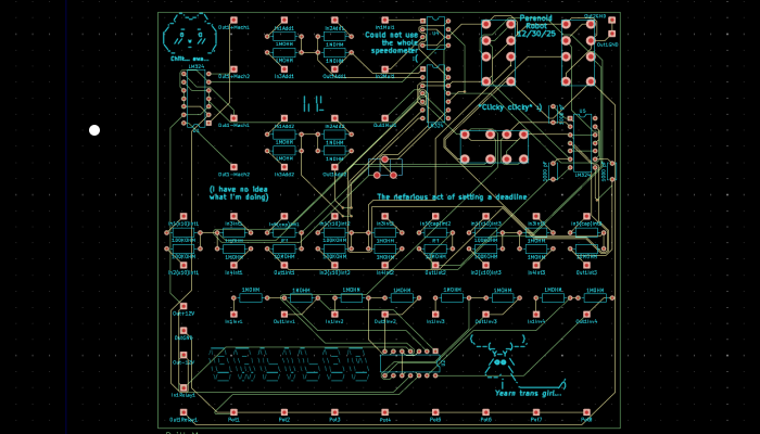 Designing the board was actually very easy. The program that I initially tried was genuinely unusable (pushy AI chatbots, forced account creation, always online, massive overhead, I digress) but people recommended KiKad. It's very rare today, but never has I used a program that was so straight forward/easy. Along with that, here's a 13 minute yt video which was the only resource I used learning the entire program, it's kinda magic!. After I designed the schematic, designed the board layout, wired the copper traces, and put memes on the board, I sent the files to an overseas board manufacturer JLCPCB (they ight). I had the choice to wait 2 weeks or pay +40$ shipping, so I waited 2 weeks. :3